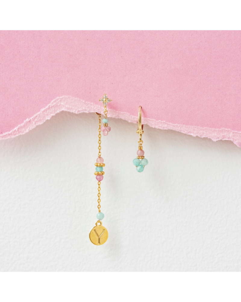 D’un côté, une puce d'oreille avec une extension composée d'une chaîne délicate ponctuée de pierres naturelles et de l’autre, une créole. La puce d'oreille fleur peut se porter sans l'extension.