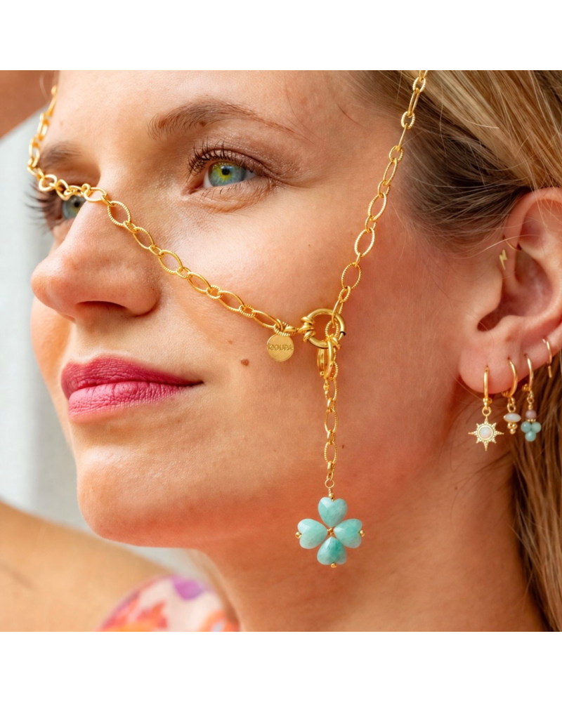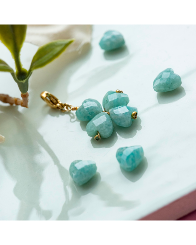 Collier Elina en amazonite et maille tendance en acier. Nous avons créé le pendentif en assemblant des pierres en forme de coeur pour symboliser un trèfle à 4 feuilles. Le charm est amovible et peut se placer partout sur la chaîne.