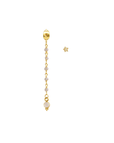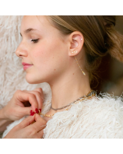 Dans L’Éclaireuse, Ondine est une monoboucle versatile qui peut se porter de plusieurs manières différentes. Pensée pour l’ear-styling : à l’unité pour composer sa carte du ciel, en paire pour une version plus classique. Ce modèle est composé d'une puce d'oreille (lune ou étoile) et d'une extension en chaîne chapelet en labradorite, connectée au papillon d'oreille.