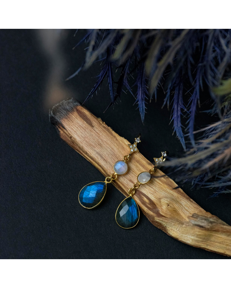 Les boucles solaris sont composées d'une goutte en labradorite associée à une pierre de lune ronde.