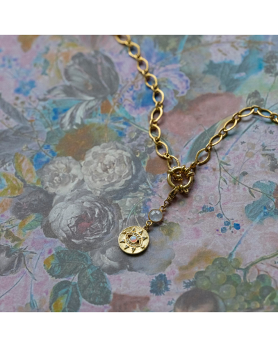 - Matière : chaîne maille en acier plaqué et charm's oeil en laiton plaqué or avec pierre de lune.