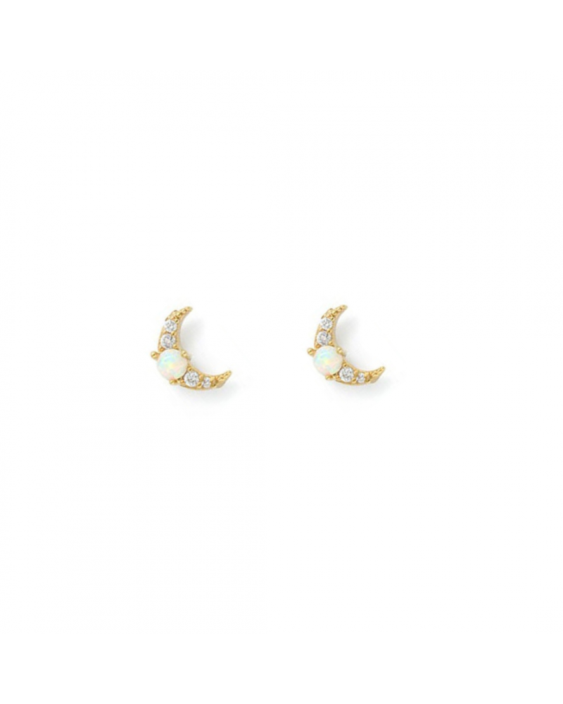 Puce d'oreille lune incrustée de strass et d'une opale noble en laiton doré à l'or fin vendue à l'UNITE.